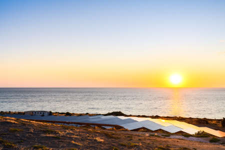 Solar energy panels on sunset background. Alternative energy source. Solar panels, photovoltaic modules.