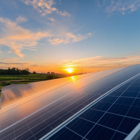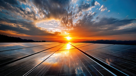 A breathtaking view of solar panels reflecting the vibrant colors of a sunset sky, showcasing a blend of technology and nature in renewable energy development.