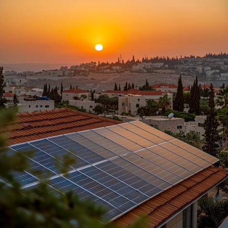 Solar Panels at Sunset with Amber Glow and Flickering Distant Lights