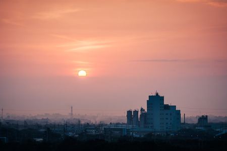 Sky sunrise with building office of factories, City scape with sunset sky background
