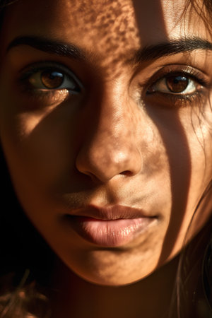 Close-up portrait of a young woman's face, illuminated by warm sunlight, creating soft shadows.
