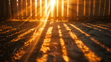 Sunbeams breaking through the gaps in a wooden fence, casting shadows on the ground