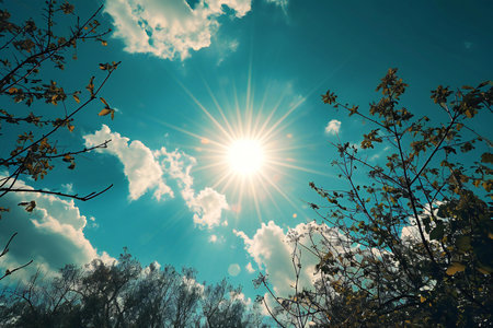 A stunning capture of bright sunlight filtering through a clear blue sky, creating warm golden tones. This image conveys a sense of peace and serenity, perfect for backgrounds.