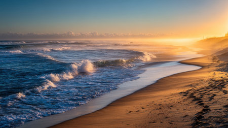 Experience the serene beauty of a sunset over gentle ocean waves, where soft sand meets the coastline. The warm gold and orange tones create a peaceful atmosphere perfect for relaxation and reflection.