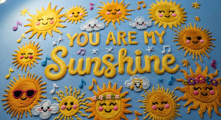 A colorful embroidered patch with smiling suns and clouds on blue background