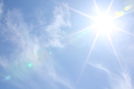 blue sky with clouds and sun reflection.The sun shines bright in the daytime in summer