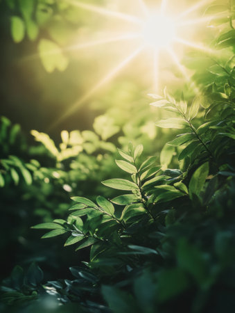 Captivating sunlight filters through lush green leaves, creating a warm and inviting atmosphere with sparkling dewdrops, perfect for nature enthusiasts and serene moments.