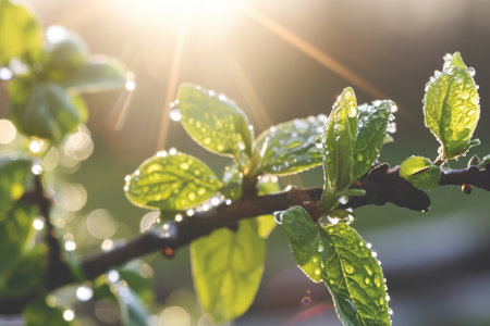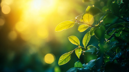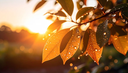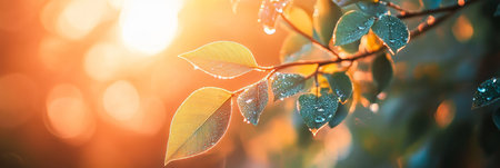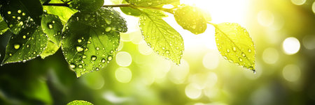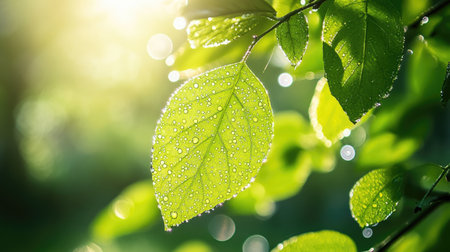 A refreshing close-up of green leaves covered in dewdrops, illuminated by warm sunlight. Ideal for nature, environment, and wellness content.