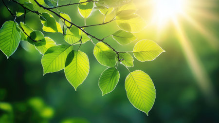 Sun-Kissed Spring Foliage Backlit Fresh Green Beech Leaves on Branch, Vibrant Nature Background