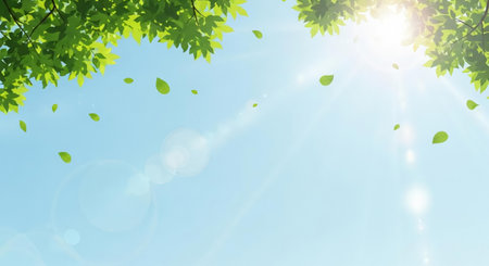 Capture nature's dance! Refreshing dappled sunlight and a blue sky with ultraviolet rays. Leaves twirl in the wind, creating a vivid and invigorating image of natural beauty.