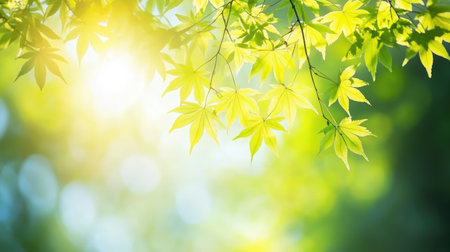 Vibrant green maple leaves catch the soft sunlight, creating a serene atmosphere in nature. The blurred background enhances the tranquility of this outdoor scene.