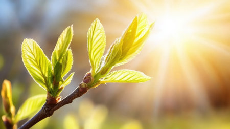 A close-up view of fresh green leaves sprouting from a branch, illuminated by warm sunlight in a serene spring garden, symbolizing growth and renewal in nature.