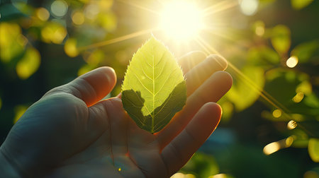 A human hand cradles a single leaf against the radiant backdrop of the sun, emphasizing the delicate relationship between humans and nature.