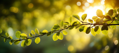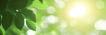 Fresh green leaves and sunlight in a forest spring background and nature banner template