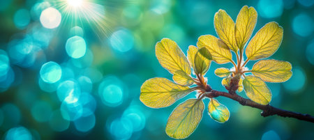 Sunlit New Growth A Vibrant Close-Up of Fresh Leaves on a Branch with Bokeh Background.