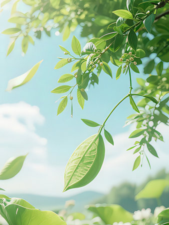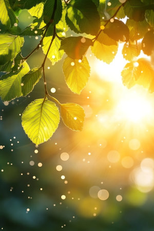 AI Generated. A leafy green tree branch with leaves that are shining in the sunlight