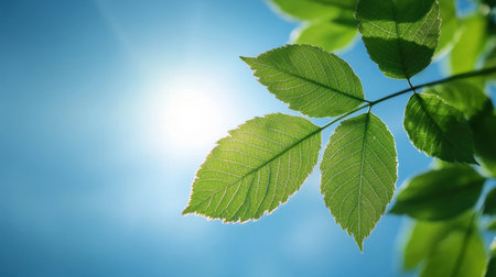 Fresh green leaves illuminated by morning sunlight against a clear blue sky, nature concept