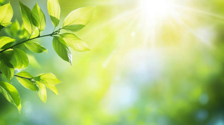 Lush Green Leaves on Branch with Sunlight in Spring Forest. Concept of Nature's Renewal, Fresh Beginnings, Tranquility, Natural Beauty. Copy space. Spring background.