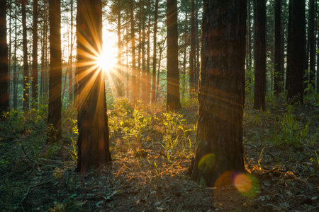 Beautiful sunrise in the forest with sun rays shining through the trees