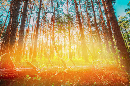 Pine forest at sunset. A ray of sunshine peeks through the trees. Skazany forest lit by the rays coming from the sun.