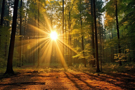 A vibrant sunrise filters through dense forest, casting radiant beams of light between tall trees. warm glow creates serene and magical atmosphere, highlighting natural beauty of woodland