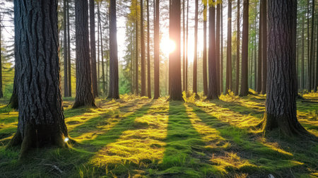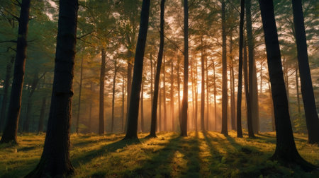 Sunbeams filter through tall trees in serene forest, creating beautiful silhouettes and illuminating lush undergrowth. warm light enhances tranquil atmosphere, inviting peace and reflection