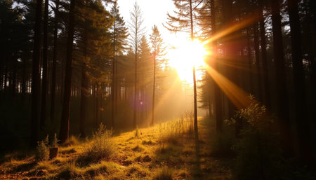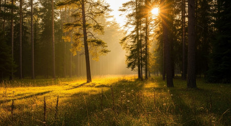 Experience the awe-inspiring beauty of a tranquil forest at sunrise, where golden sunlight filters through towering trees, creating a magical atmosphere.