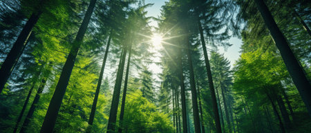 Green Forest of spruce trees, looking up. Sun rays shining through trees, nature background. wide panoramic