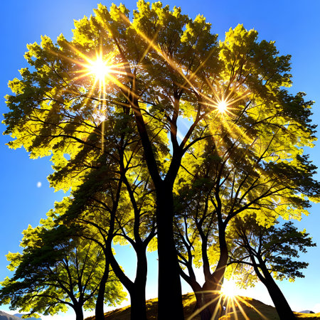 A stunning view of a majestic tree with intricate branches and leaves reaching towards a bright blue sky, sunlight filtering through for a serene outdoor aesthetic.