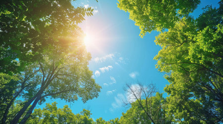 Sun shining brightly through the trees of a lush forest, with a clear blue sky overhead. Plenty of space for text in the foreground.