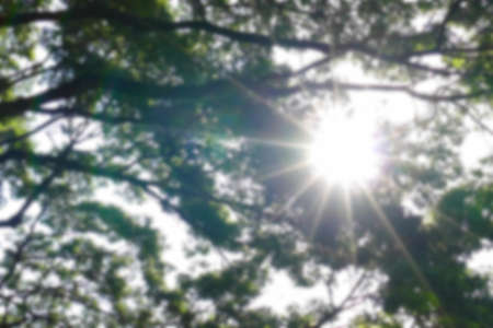 sunlight through branch and leaves of big tree with flare (blur and defocused)