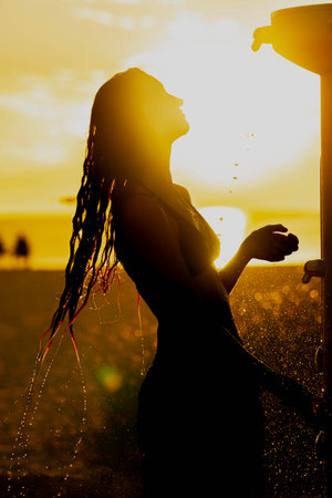 Beautiful girl takes a tropical shower outdoors at sunset. Hygiene and beauty care. Spa water treatments.