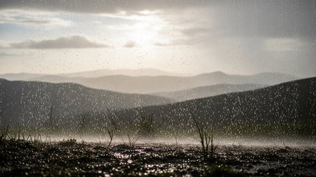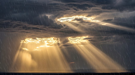 A dramatic scene with rain falling from the sky while the sun breaks through the clouds, casting rays of light across the landscape.