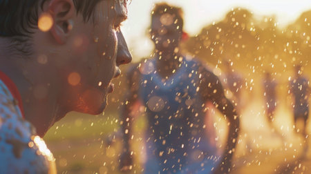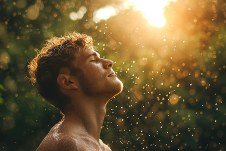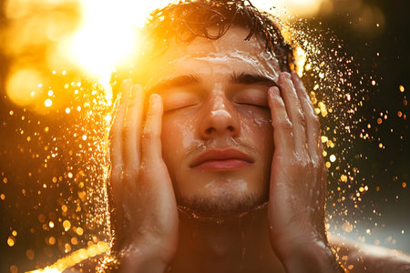 Young man washing his face with water, eyes closed, surrounded by golden sunlight and splashing droplets, evoking freshness, relaxation, and rejuvenation. High quality photo