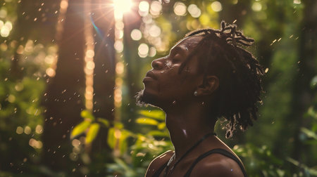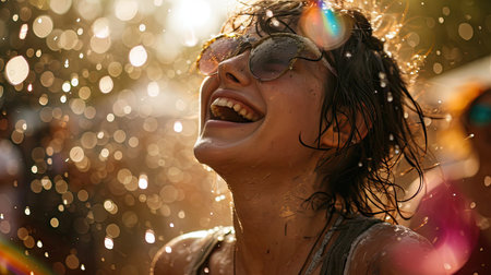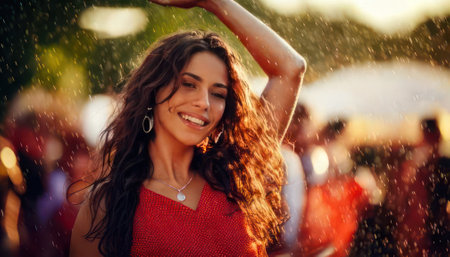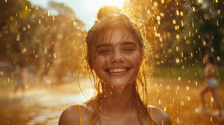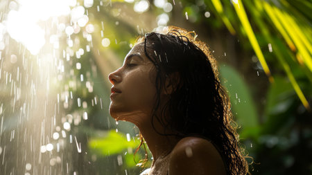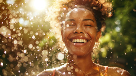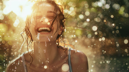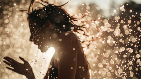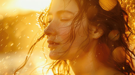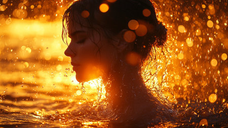 A beautiful woman stands in radiant golden sunlight with her eyes closed, water droplets sparkling around her. This serene moment captures peace and tranquility.