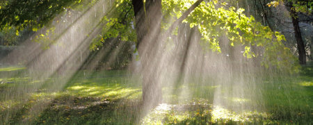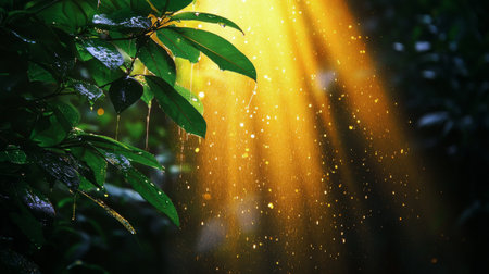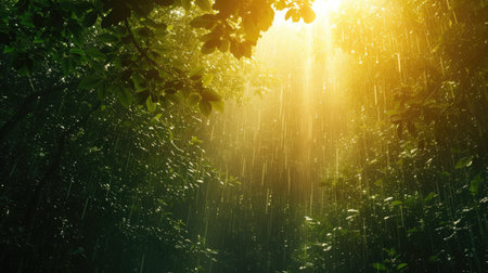 The sun is shining through the rain, creating a beautiful and peaceful scene. The raindrops are sparkling in the sunlight, making the scene look like a work of art