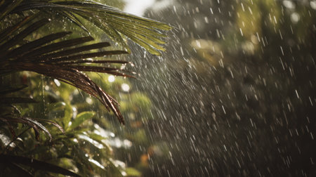 Captivating image showcasing rain falling gently on bright green leaves in a tranquil tropical garden, highlighting the serene beauty of nature during a refreshing shower.
