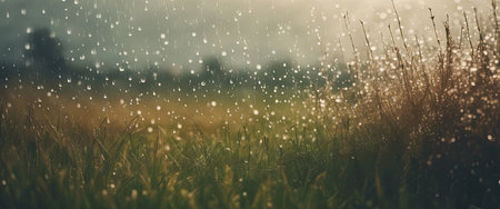 A stunning view of vibrant grass glistening with raindrops under a warm sunset. The sparkling droplets create a magical atmosphere perfect for nature lovers.