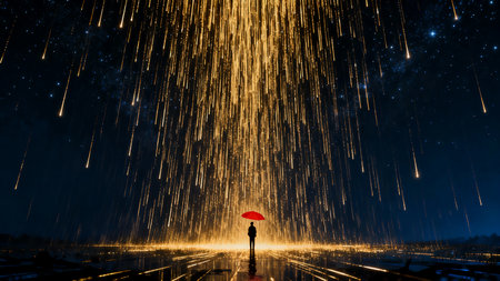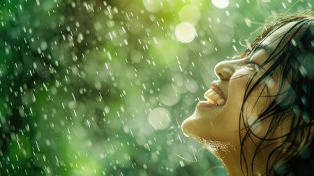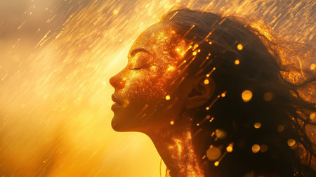 A woman radiates beauty with glowing rain trails illuminated by golden light, her profile merging elegantly with the gentle energy of a storm, capturing a moment of serenity and wonder.