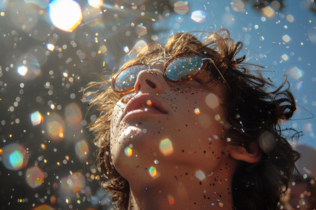 Joyful young man laughing in water, wearing a shiny golden shirt with sunlit sparkling effects