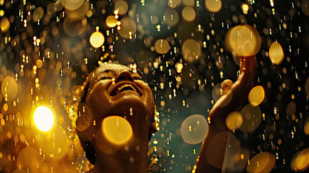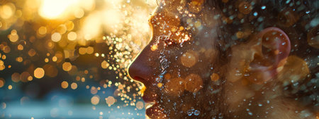 Artistic portrait of a person in profile, illuminated by golden bokeh lights with water droplets on the face, creating a magical and surreal effect.