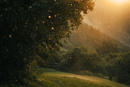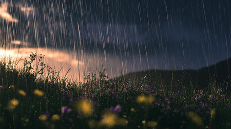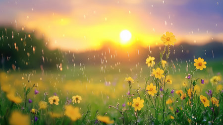 A soft rain falls on blooming yellow flowers at dusk, warm tones and water droplets enhance the peaceful mood