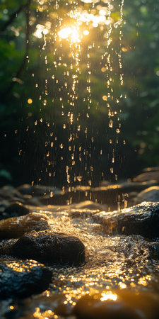A tranquil stream glistening in golden sunlight, with water droplets cascading over polished stones.