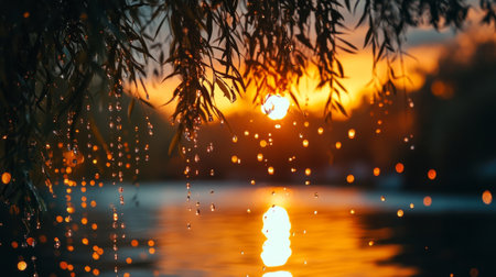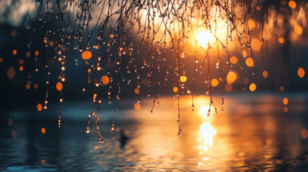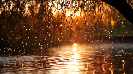 Rain-soaked willow branches dripping water, reflecting the warm hues of sunset, tranquil riverbank generative ai