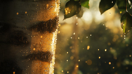 Close-up of a birch tree trunk with dewdrops sliding down, soft warm colors, serene forest setting generative ai
