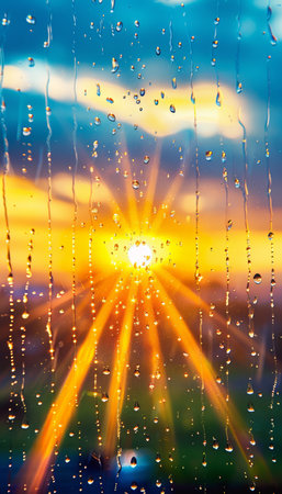 Sun Shining Through Rainy Window, Creating Glowing Streaks and Water Droplets Refracting Light.