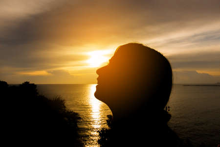 Silhouette of the woman smile at the beach during beautiful sunset.