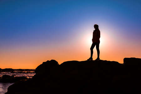 Beautiful woman at the beach on top a of a rock in silhouette