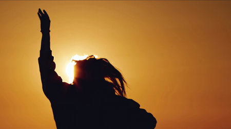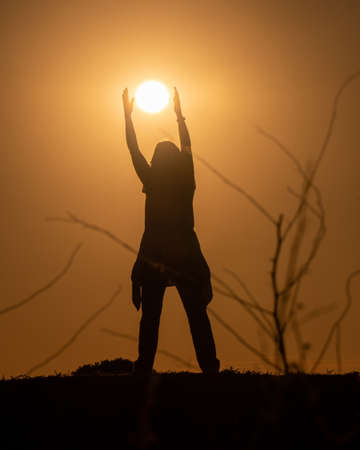 Silhouette of a woman in the countryside trying to catch the sun at sunset. Black contrast with golden orange. Vertical image.