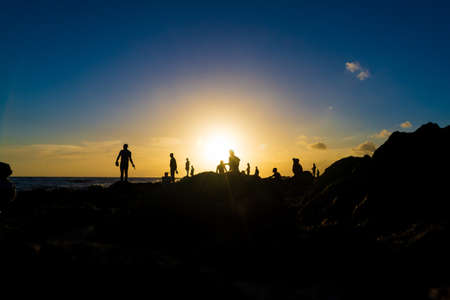 Silhouette of people on top of the beach rocks. Late afternoon in Salvador, Bahia, Brazil.